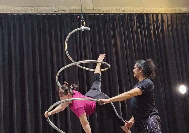 Spin into fun and strength in our Hoop class, unlocking courage and beauty within you. Join us for a thrilling journey of aerial artistry guided by expert instructors!